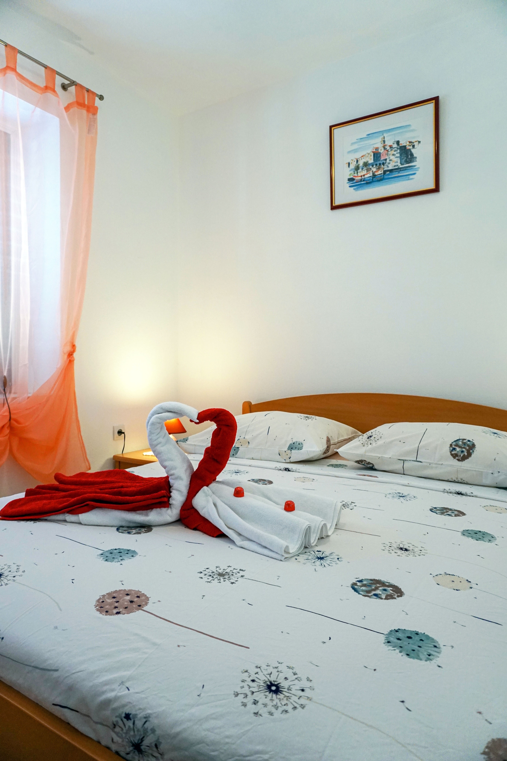Apartment can accommodate 4 guests. Beds are situated in 1 sleeping rooms, but also in the living room, within 29m2. Guests can use a private terrace to enjoy the warm summer evenings. The apartment offers the sea view. Food can be prepared using barbecue which is shared with other guests too. INCLUDED IN THE PRICE: tourist tax, final cleaning, air-conditioning, central heating, parking, internet, laundry, boat mooring, baby cot, iron, ironing board, hairdryer. OBLIGATORY ADDITIONAL COSTS: short stay fee (surcharge depending on a number of booked nights: 30% - 1, 20% - 2, 10% - 3). OPTIONAL ADDITIONAL COSTS: breakfast (€10.00, a 50% discount for children aged 4 to 12 years, Children up to age 4 free of charge), half-board (€30.00, a 50% discount for children aged 4 to 12 years, Children up to age 4 free of charge). The availability of additional services for your chosen dates of stay, as well as their prices (if none are listed) must be checked ahead of time. Any additional services not shown in the price calculation are payable directly to the property owner and only if used by the visitor. Discounts to the base price: free day 14=13 (for reservations of 14 or more days you get one free day for the stay until 31122026).